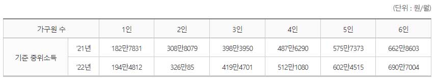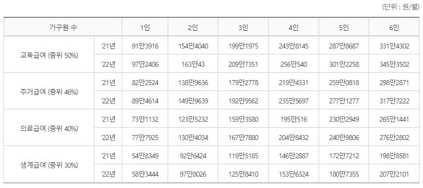| 생계급여 | 58만3,444원 | 97만8,026원 | 125만8,410원 | 153만,6324원 | 180만7,355원 | 207만2,101원 |